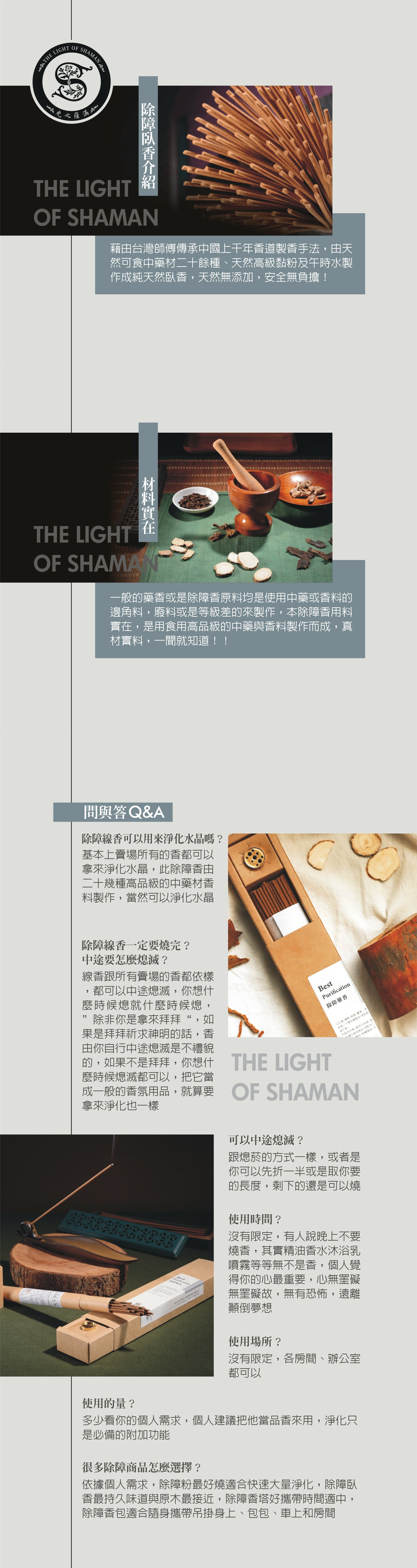 這批除障藥香其實從配方到推出就整整花了三年,其實我的賣場大部分都是除障淨化用的外國原料香品,但是其實以除障而言,我們自己東方的原料或配方也是非常棒的,這款除障藥香與賣場自製香最大的不同就是,他是複方香,而之前推出的聖木線香,白鼠尾草線香都是單方香品,這款除障藥香用了沉香,檀香,柏香,藿香等二十幾種中藥材製成,是想,一種香就有除障淨化效果何況是多達二十幾種香,效果更是相輔相成而且有加倍加成的效果.而且,通常市面上會拿來做香的中藥材料通常都是邊角料,淘汰料拿來做香,我們的香非常的實在,真正真正100%是用人吃的食用等級做的藥材下去打粉而做成的,一樣是請製香師父用傳統製香工藝,依據日期,時辰,氣候及傳統製香方法去做的,黏粉比例很低,而且是高級天然黏粉下去做的.所以所有的原料100%都是天然的真材實料下去做出來的.因為藥粉打得非常的細緻(人吃的等級的藥粉,所以用出來很扎實,可以燒特別久,是一般臥香的兩倍時間,而且做這批香的時候正好遇到了端午節,所以還特地請製香師父在端午節當天午時開始11:00的時候推出去日曬曬香製成,為的就是吸收天地至陽之氣以強化除障效果。